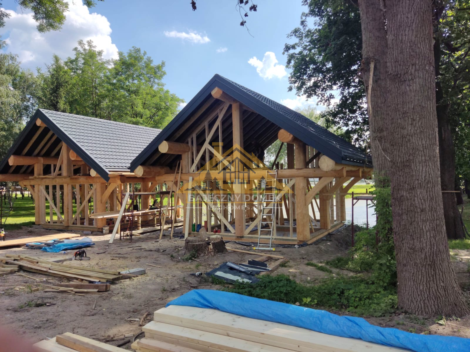 W przypadku domu na 2 miesiące przed rozpoczęciem prac fundamentowych rozpoczęto procesy zakupu i produkcji ramy z bali dla projektu. Wybór padł na sosnę Archangielską o średnicy 260. Dom z bali z legarami poskładano w 2,5 miesiąca, nie było żadnych trudności z wniesieniem, rozładunkiem i montażem na miejscu, tylko przy tej średnicy przy podnoszeniu drugiego piętra używano własnych środków mechanizacji, ale to już standardowe zdarzenia .